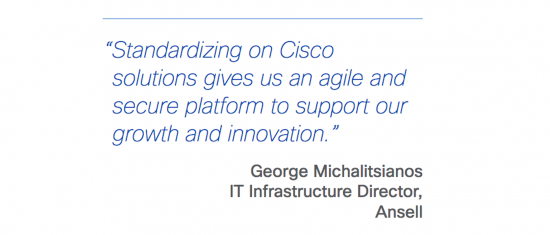 Re-define global protection – George Michalitsianos inherited a tall task when joining Ansell. The Board of Directors had made cybersecurity a priority to make sure it reduced its intellectual property and technology risks through beefed up security. The Cisco partner started with updating Ansell’s its network with Cisco solutions for threat-focused, next-generation security. Ansell would benefit from the Cisco Security