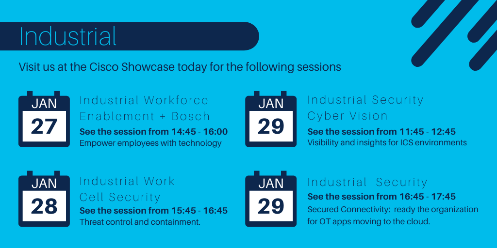 Your workforce is changing. How can you securely bridge the gap between plant and field locations andremote and local workers? Join us for conversations on how Cisco Security solutions and workforce enablement technology can transform your business.