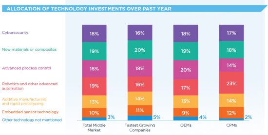 Technology on the factory floor:  Manufacturers are making investments in some key areas. The report found there were five top areas that middle market manufacturers are focused on.