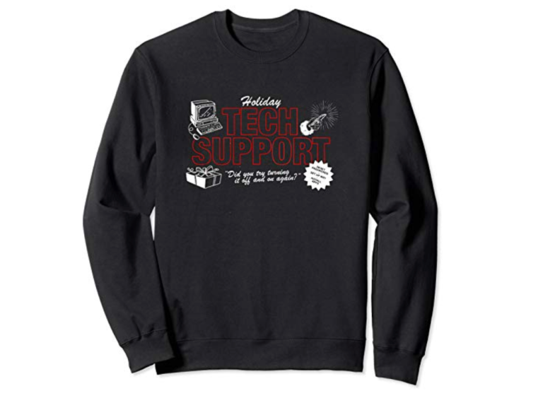 “Did you try turning if off and on again?” Over the holidays, the networking expert you love will almost certainly be asked to help with Grandpa’s home Wi-Fi router. This sweater puts the standard tier-1 tech support screener question on their chest.