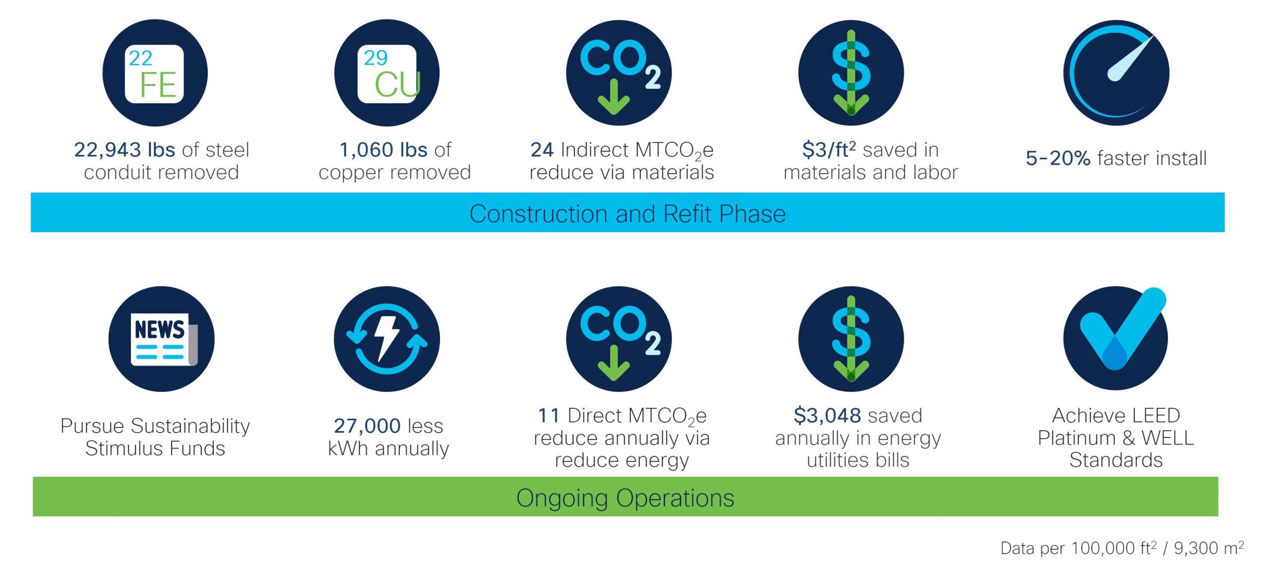 - Reduces the up-front construction cost and time to completion when using PoE for cabling, installation, and configuration, including a dramatic reduction in installation “carbon footprint” – no conduit required, no high voltage copper wiring required
