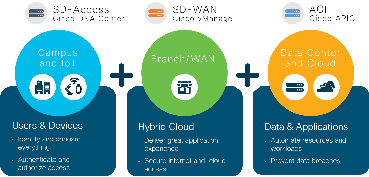 In the real world, each network domain serves a unique set of requirements. The campus network handles wired and wireless clients with high mobility demands and varying identity mechanisms. The WAN finds the most efficient route from user to application through the multiple connectivity options. The data center delivers high east-west bandwidth and control, integrating with virtual machine and container environments.