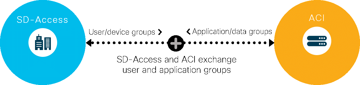 When integrated, SD-Access and ACI exchange their groupings and provide each other an awareness into their access policies. With this knowledge, each of the domains can map user groups with applications, jointly enforce policies, and block unauthorized access to applications.
