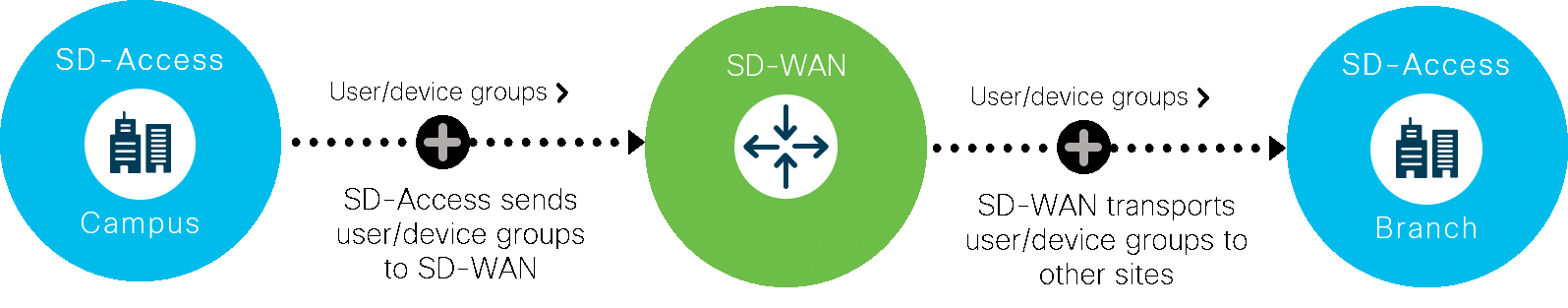 In another segmentation policy integration, Cisco SD-WAN connects with SD-Access and distributes user and device groups between an organization’s campus and branches, covering them all in a seamless access fabric. Access policies defined by SD-Access now apply consistently across all the organization’s sites.