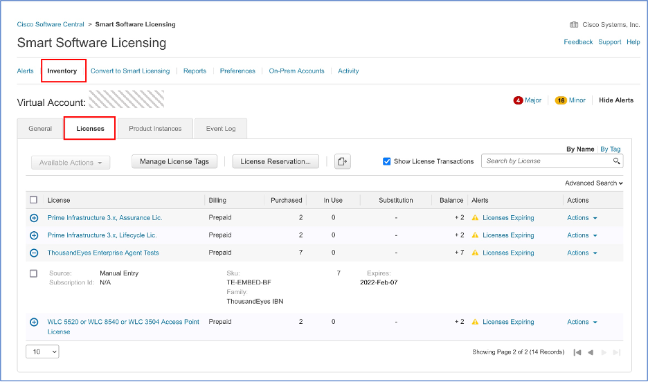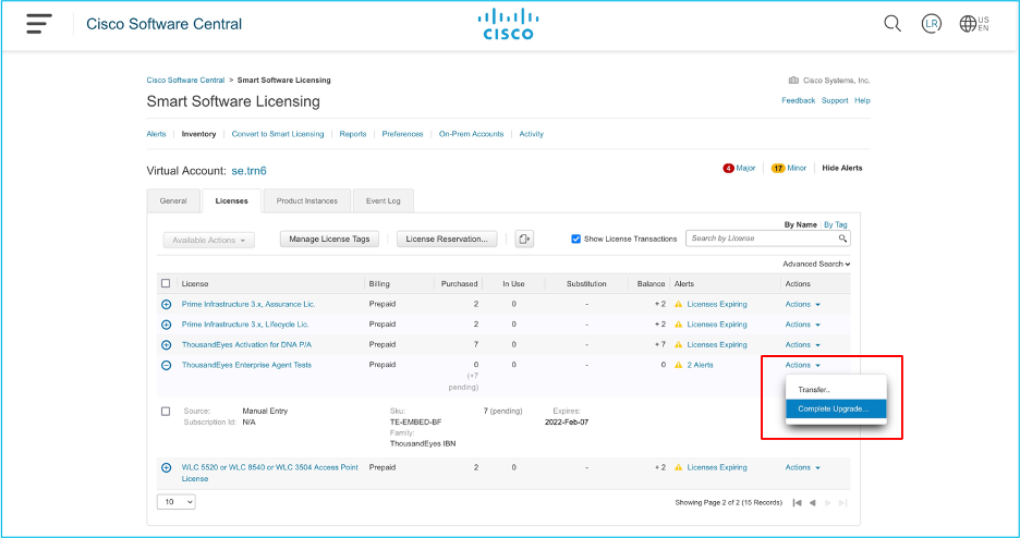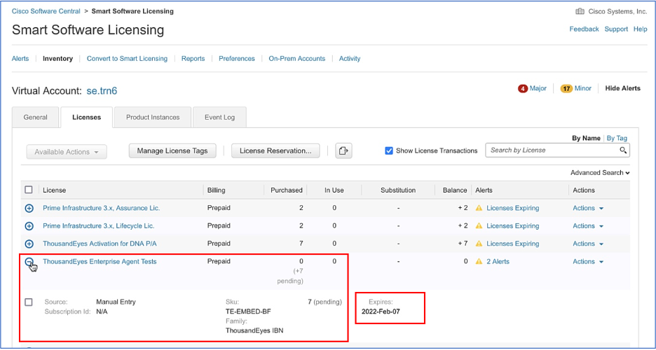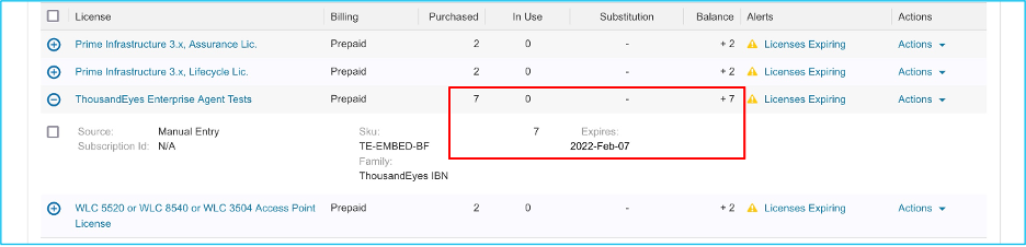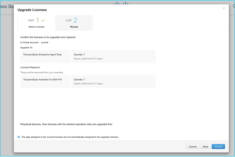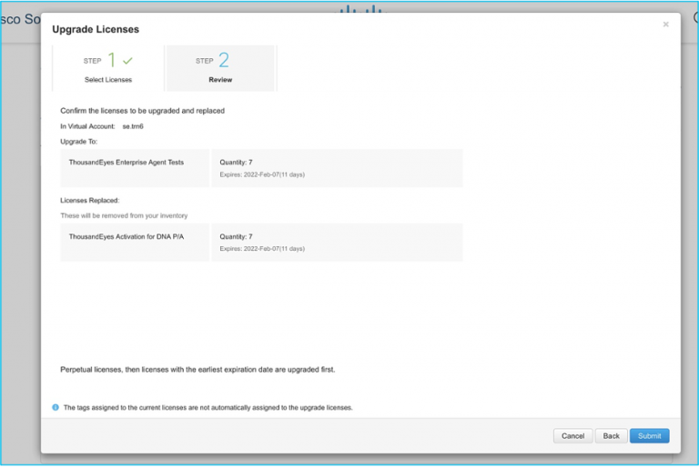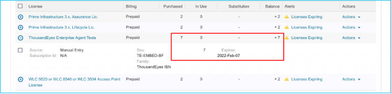 The submission automatically triggers the provisioning call to ThousandEyes. Afterward, you will be able to see the DNA licenses in your account that are used for the ThousandEyes entitlement.