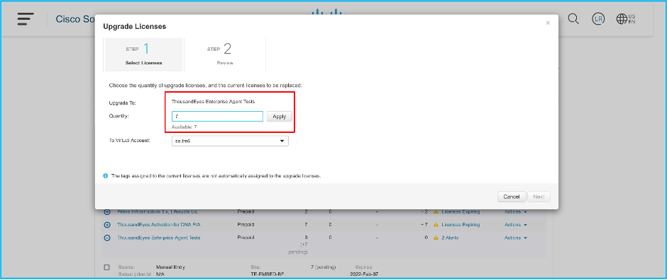 In this step, we need to select the quantity of DNA licenses we want to leverage for ThousandEyes activation. The most common use case is to select the whole quantity available.