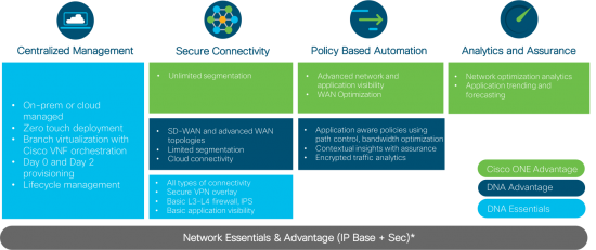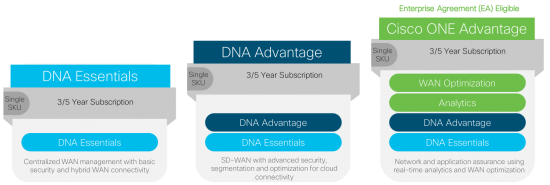 Now, disruptive solutions need to be coupled with new-age business models – one that embraces cloud and utility-based consumption. We are thrilled to announce new Cisco DNA based software subscription licenses for our WAN portfolio: DNA Essentials, DNA Advantage and Cisco ONE Advantage across the Enterprise routing and Viptela portfolios– ISR 1000, ISR 4000, ASR 1000, vEdge and ENCS 5000.