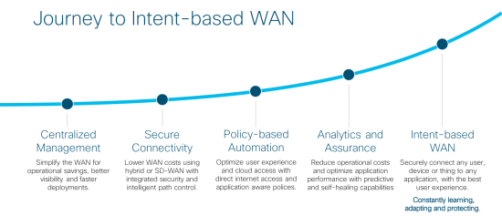 The result is a fundamentally different WAN architecture – one that is able to offer connectivity, security, application experience and cloud access. To meet these needs, in March, we announced Intent-based networking for the WAN.