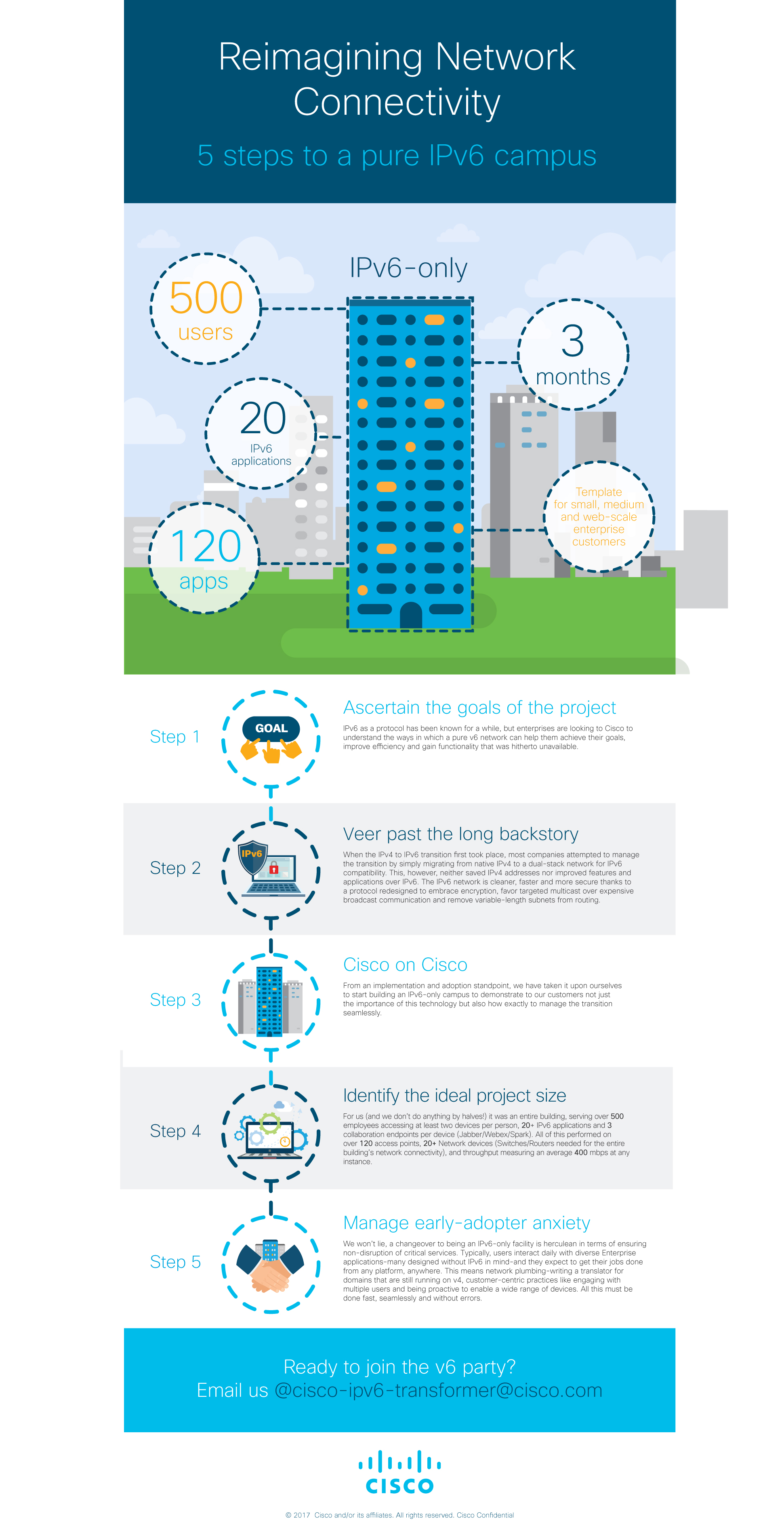 Cisco has been one of the early pioneers in this space. From an implementation and adoption standpoint, we have taken it upon ourselves to start building an IPv6-only campus to demonstrate to our customers not just the criticality of this technology but also how exactly to manage the transition seamlessly.
