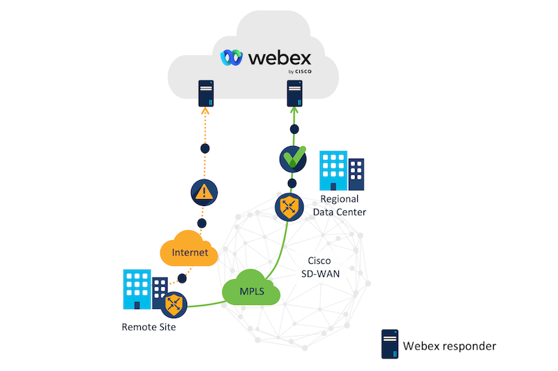 Cisco SD-WAN empowers enterprises with this high-quality networking experience. Cisco SD-WAN streamlines and improves the user experience for SaaS by using a combination of network path probing and application analytics to always calculate the best path and steer traffic over this optimal path. Cloud OnRamp for SaaS, a feature of Cisco SD-WAN, segregates application traffic, like Webex, from generic internet traffic and routes it via the best path, from a specific branch router, to deliver a seamless, consistent, and high-quality user experience.