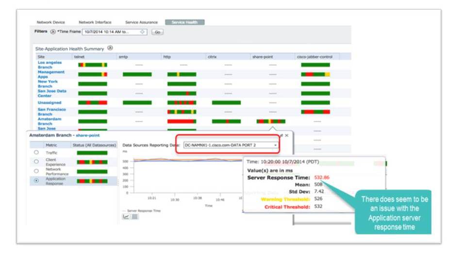 workflowIf you have a network analysis module (NAM) deployed, you can integrate it with Prime to do in-depth traffic analysis. You will get granular insight of your network and application performance. The chart below shows such an example.