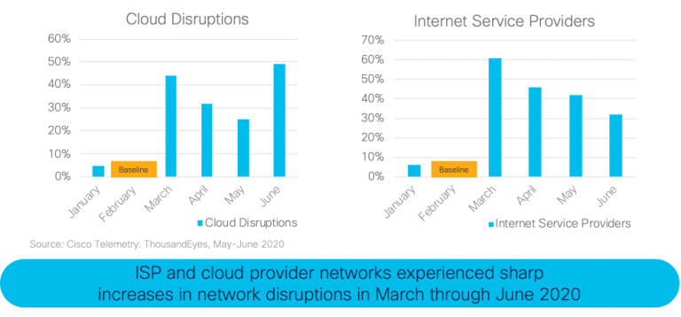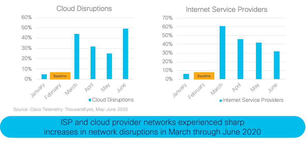 When an employee must call the help desk because they are experiencing issues and can’t access the application they need, it’s paramount to have the right visibility to get to root causes quickly. This capability is even more essential when the business is trying to adapt during a time of disruption. Network operators need to know when the issue is coming from the device, home or coffee shop network, access point, application, ISP or cloud provider, or the campus network. Recently, our ThousandEyes solution saw sharp global spikes in both Internet and cloud service disruptions in March through June 2020. An essential component of a multicloud strategy is to ensure you have the right observability – from users to applications – so you’re not flying blind when you need detection the most.