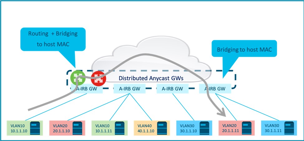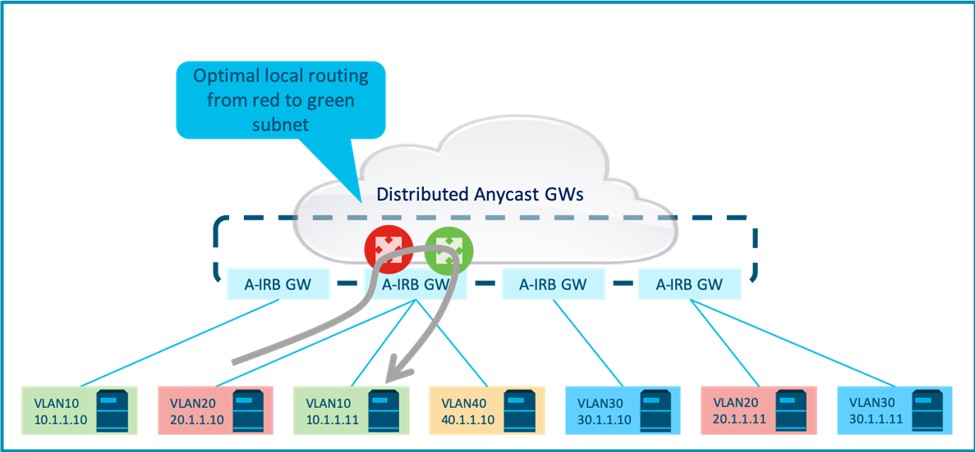 As in asymmetric IRB, local inter-subnet flows are always routed locally on the ingress GW, while inter-subnet flows across the fabric are always routed directly to the egress GW.