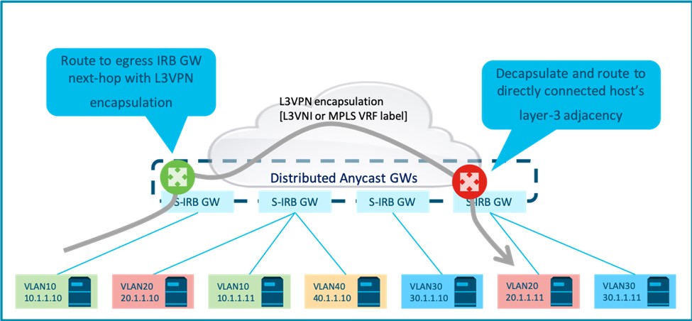 - The ingress GW no longer has layer-3 adjacencies to ALL overlay endpoints in an IP VRF. It only has host routes for all end points via a tunnel to the destination GW next hop.