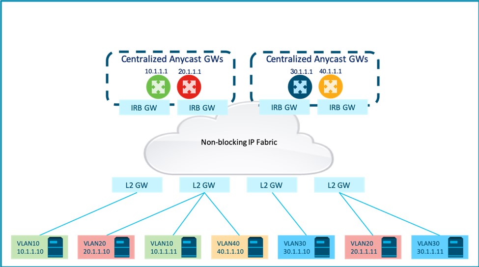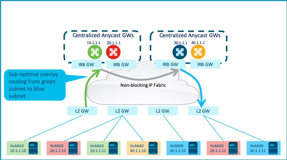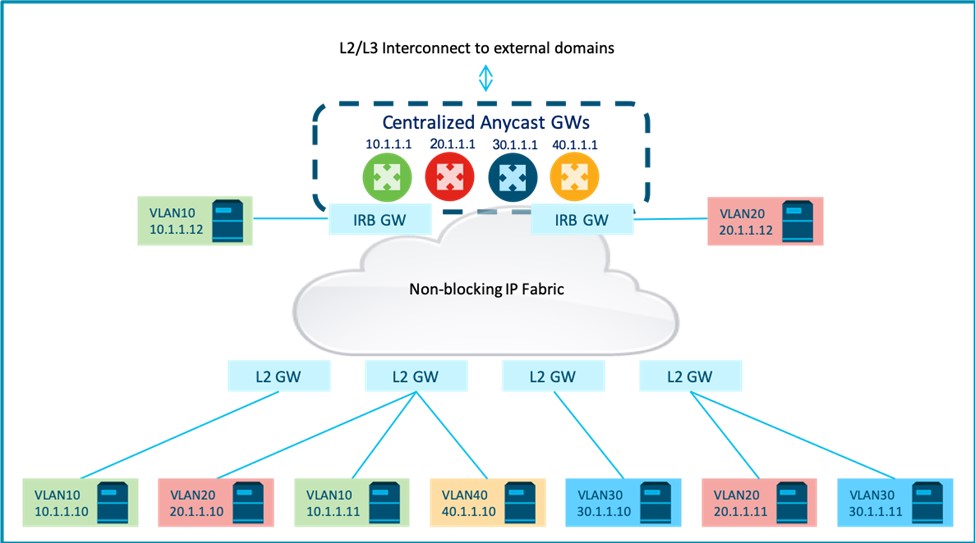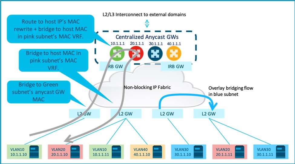 A centralized routing model connects endpoints to layer-2 EVPN gateways (GW) that provide VPN bridging. This enables intra-subnet flows across the overlay while all routing to endpoints in different subnets, within and outside the fabric, is centralized via designated Integrated Routing and Bridging (IRB) L2+L3 GWs.