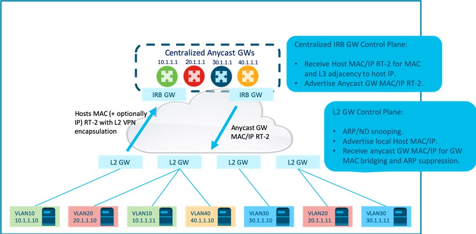 - If L2 GWs only advertise host MAC routes in the EVPN control plane, host layer-3 adjacencies are learnt on the Anycast GW via ARP and ND. Since adjacencies could be learnt on any of the redundant GWs, Anycast GWs must implement additional mechanisms to sync layer-3 host adjacencies across them. Alternatively, L2 GWs must implement MAC-IP learning via snooping and advertise the host MAC and IP via the EVPN control plane for Anycast GW nodes to learn host layer-3 adjacencies via EVPN.