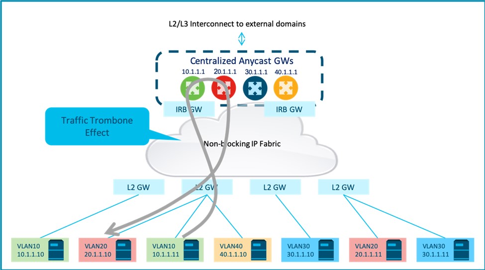 The sub-optimal nature of inter-subnet routing in this approach applies to local inter-subnet flows that must always be bridged on the ingress L2 GW to the centralized IRB GW, only to be routed back to the ingress L2 GW. This results in a ‘traffic trombone effect’ (see Figure 7).