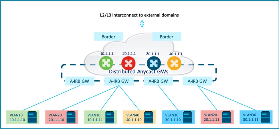 It is common to deploy first-hop Anycast routing for all overlay subnets in a fabric on the same set of IRB nodes. While not necessarily required, this is often done for operational simplicity and optimal routing. It is also common for this first-hop routing function to be hosted on border nodes that also act as interconnect GWs to external L2 or L2/L3 domains. Optionally, these IRB nodes may also function as edge nodes and connect to local overlay endpoints, resulting in the model shown in Figure 2.