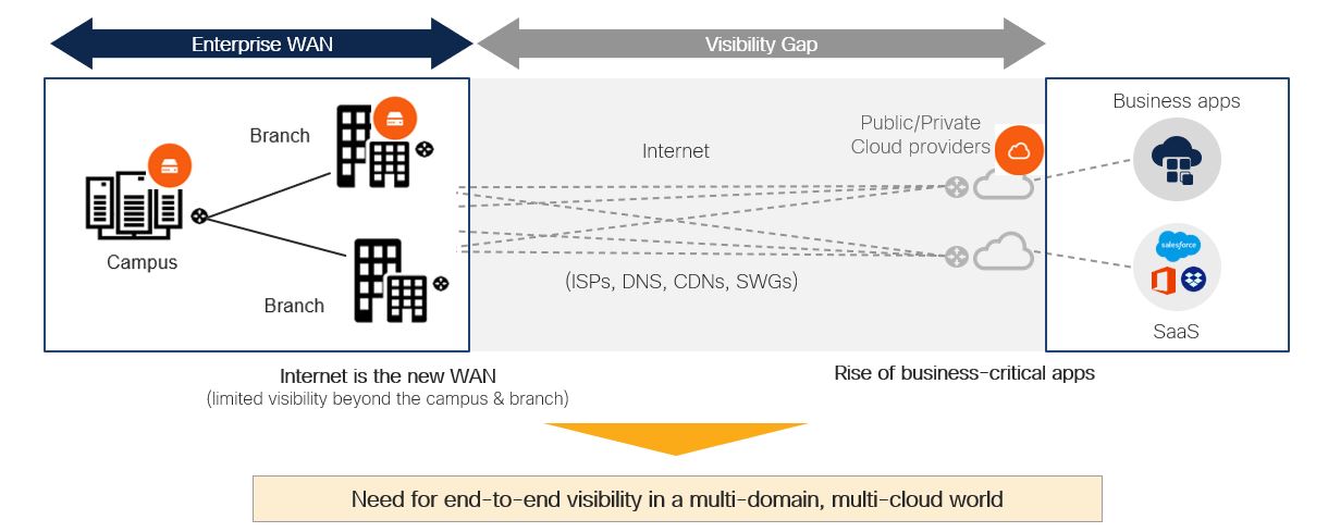 One of Enterprise IT’s highest priorities is the need to deliver high-quality experiences for business-critical applications to a very distributed base of employees, partners, and customers. However, if NetOps can’t see and manage problems both inside and outside the enterprise network, application experience is out of their total control. From Enterprise IT’s point of view, there is a lack of observability for cloud and SaaS applications. Up until now, there has been no single internet and cloud intelligence platform to obtain insights for remediation for applications distributed from data center to multicloud to edge.