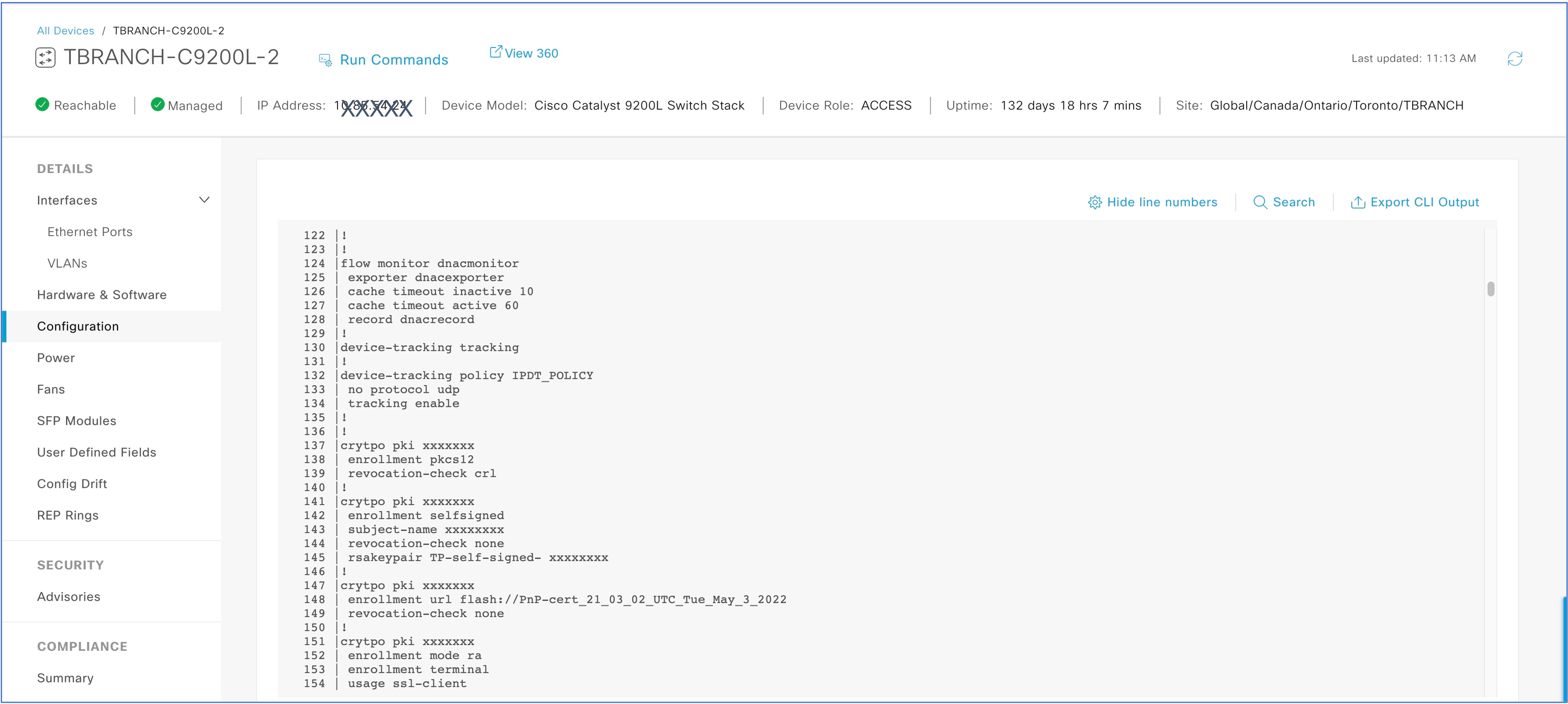 For certain device types, like switches, DNA Center has the option to show and export the full device configuration. This allows the network administrator to have quick visibility into the configuration. For security reasons, sensitive data is masked which means that we can’t directly use this device config to restore a device.