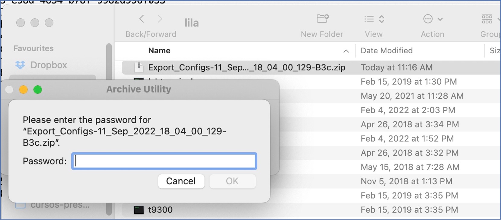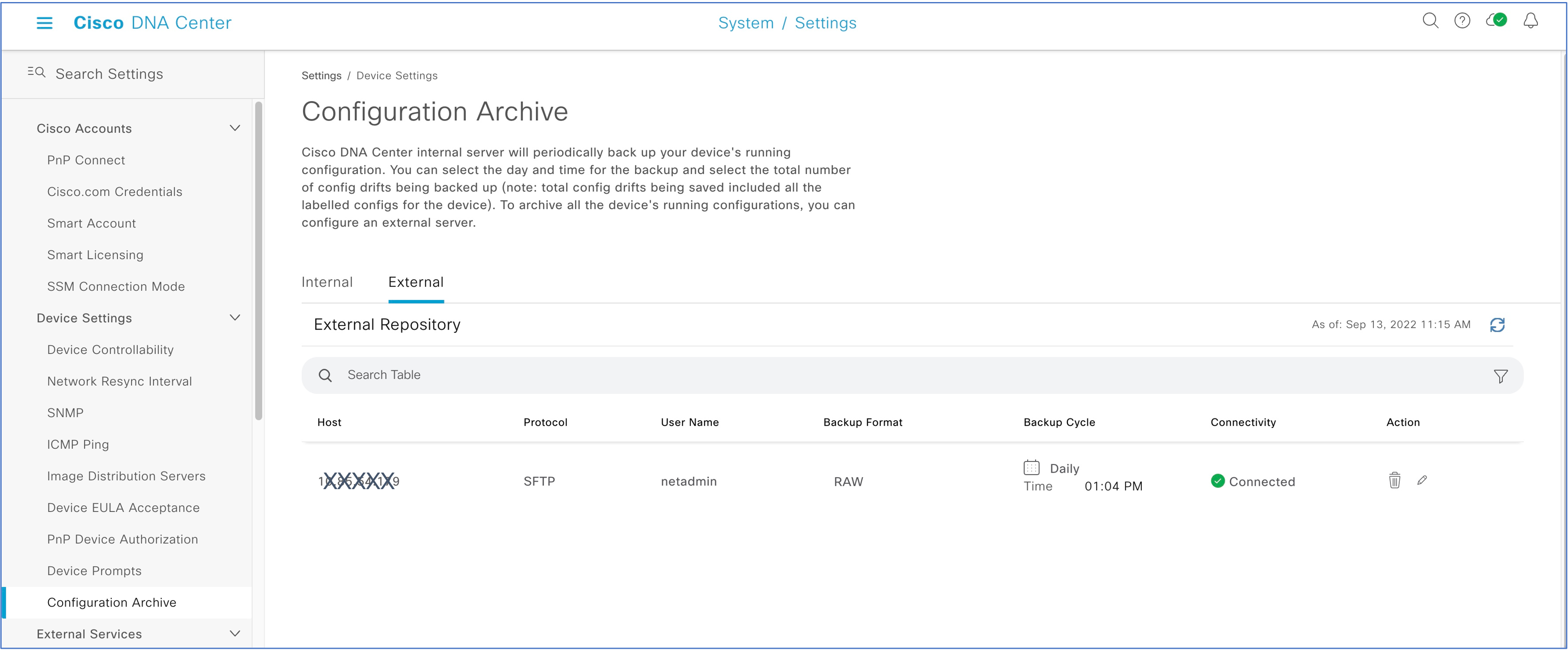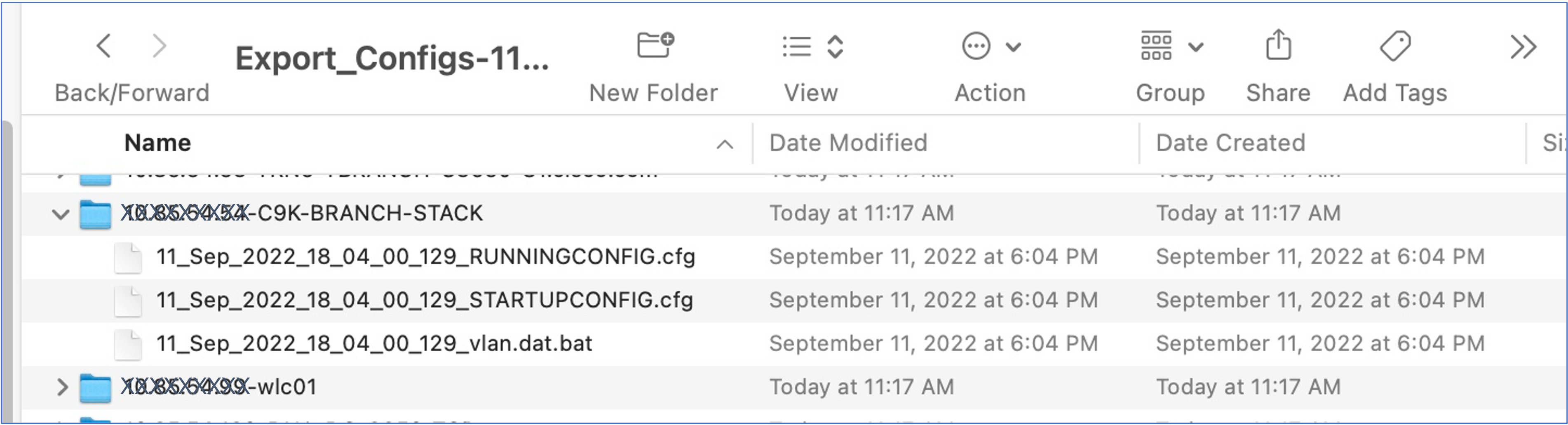 Device configuration backup can be scheduled with the desired recurrence and the configurations are sent to an external server. For each configuration backup, DNA Center creates a password-protected zip file. This zip file contains one directory per device and each directory contains three files: running-config, startup-config, and VLAN database.