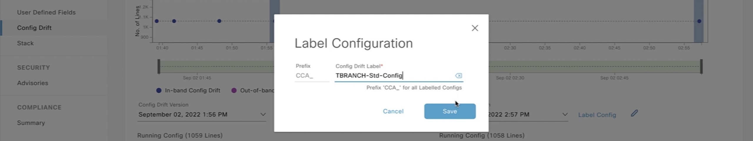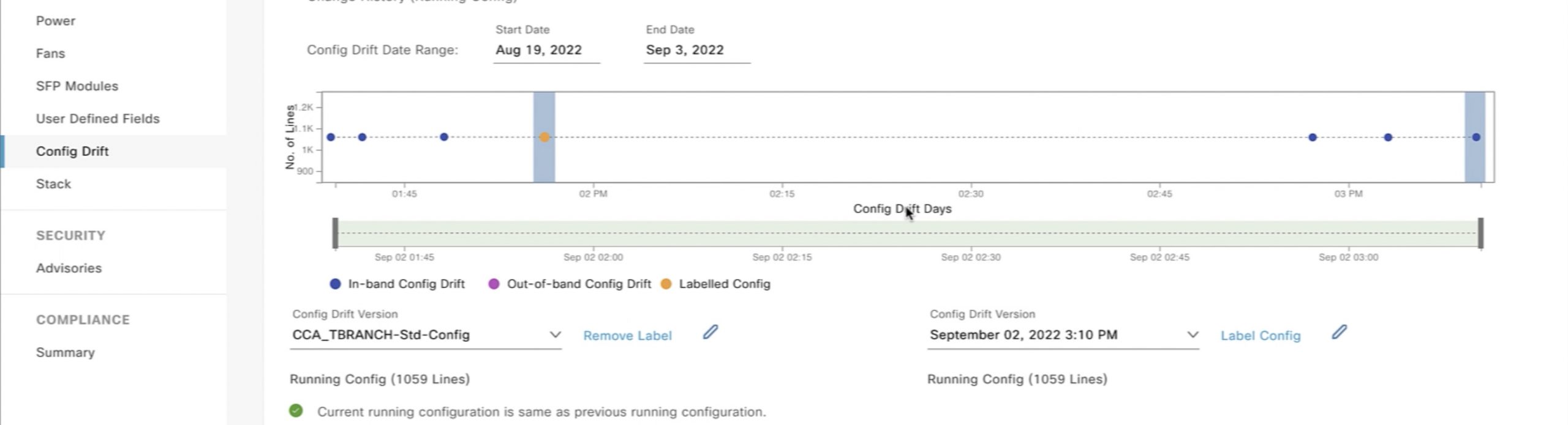 Once we label our standard configuration, we can then compare it to the current configuration. In this example, the current running configuration is identified as “September 2nd at 3:10pm”. In this case, both running configuration and standard configurations match.
