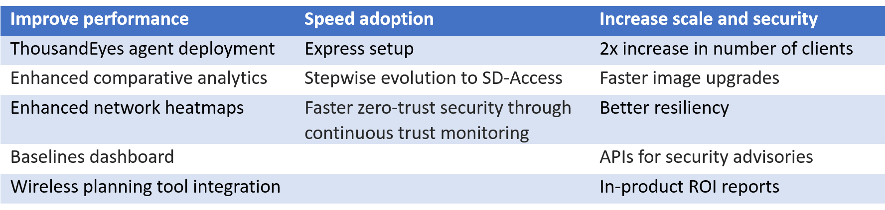 The new Cisco DNA Center comes with several exciting innovations that are true to its core mandate – strong connectivity, enhanced security, and a delightful IT experience for both users and administrators. The table below summarizes some of the key enhancements.