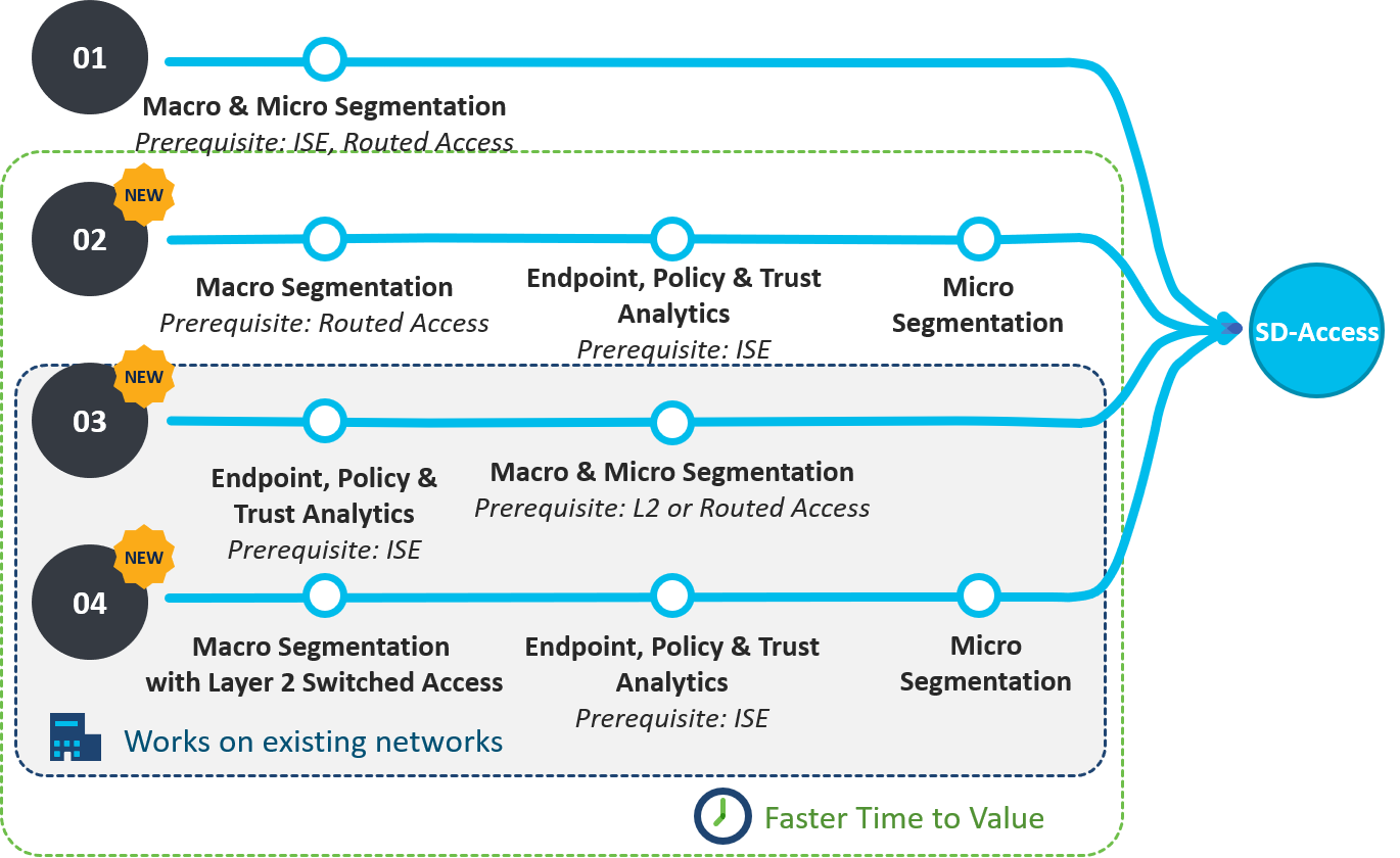 As you are rushing to complete your network changes, you will appreciate that the new Cisco DNA Center can be up and running quickly. We have also defined easier step-wise journeys to evolve your network to the visibility and security of SD-Access that you can undertake starting from where your network is currently.