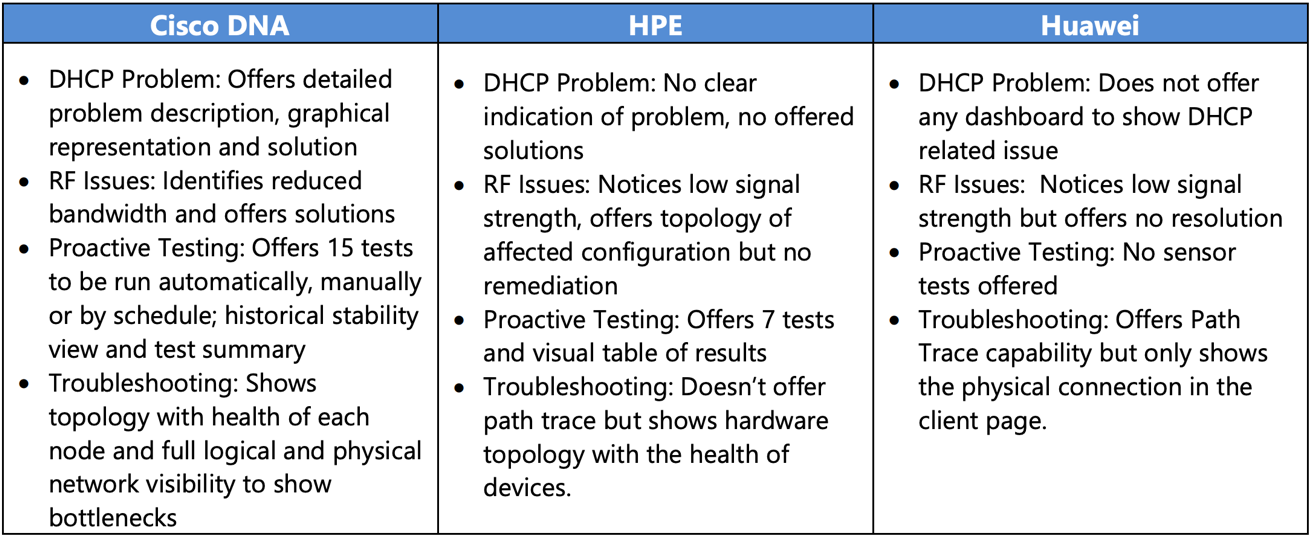 Miercom, a 3rd party vendor, produced an independent report that compares the publicly available versions of Cisco DNA Center, Huawei eSight and Aruba Connectivity Health. Miercom tested four issues that are common in any network and gauged how each platform helps a network admin to troubleshoot and resolve them.
