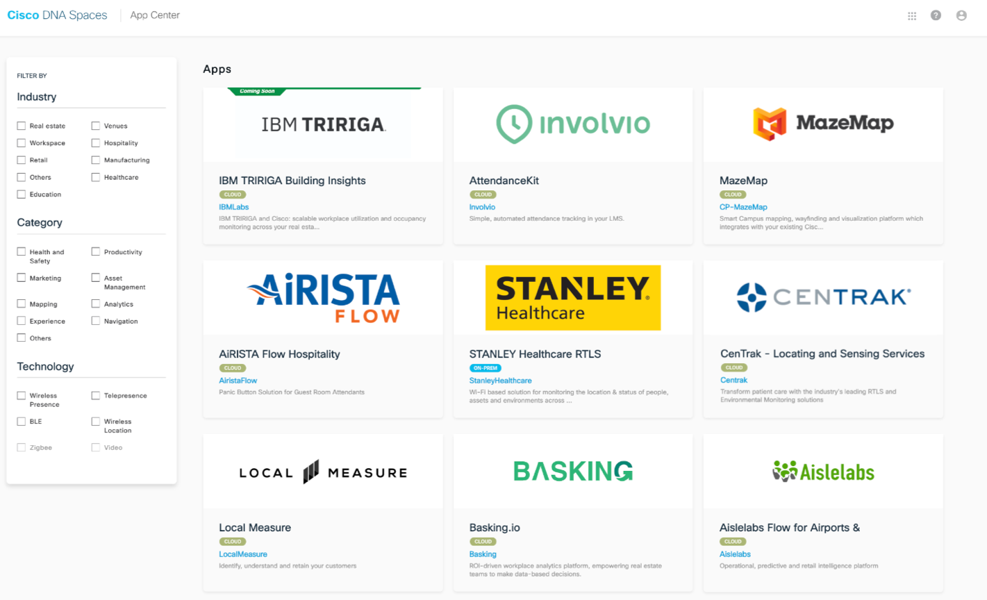 Cisco DNA Spaces also has an ecosystem of partner applications that are easy to activate. The Cisco DNA Spaces App Center features industry specific partner applications that leverages the location data from Cisco DNA Spaces, delivered over the Firehose API, to drive business outcomes across healthcare, workspaces, retail, hospitality, education, and manufacturing.
