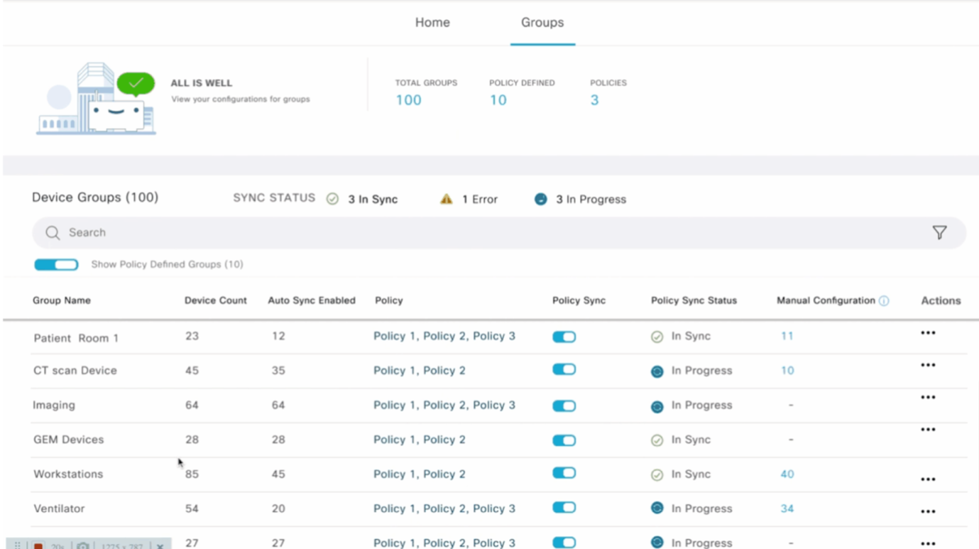 Device management is made simple with the ability to apply policy-based configurations to the device groupings.
