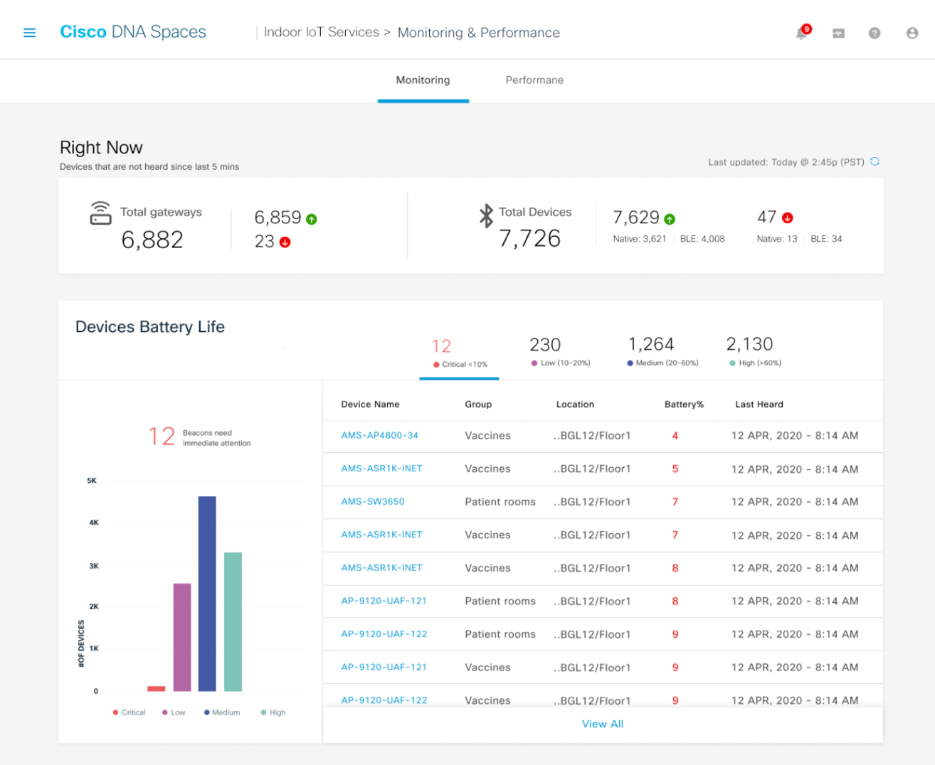 End-to-end monitoring & support capabilities are also being expanded to include the end devices, in addition to Cisco DNA Spaces location data, access points, and partner applications. Monitoring will now include device battery level, last heard, and firmware to ensure that your end devices are working optimally.