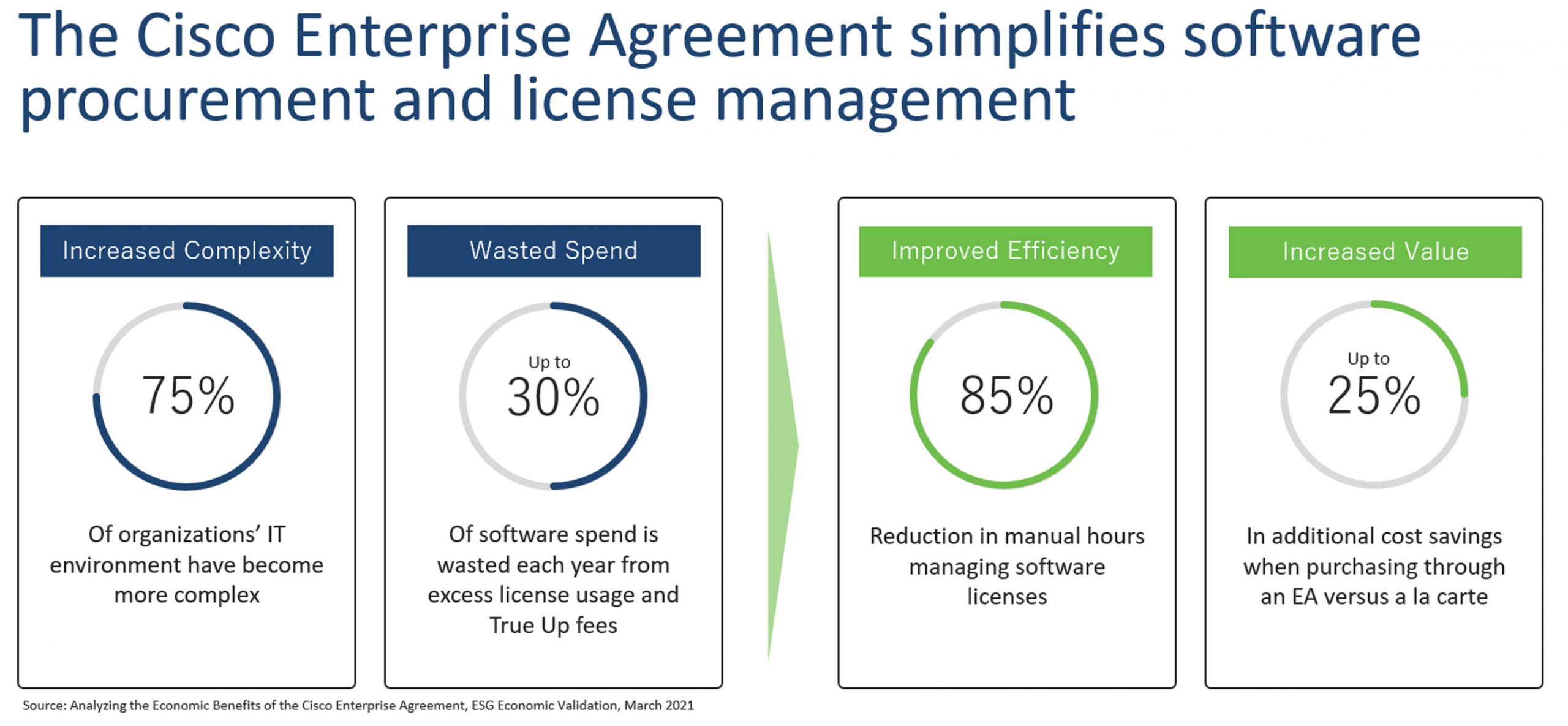 Let’s start off with what hasn’t changed. A Cisco EA still enables you access to world-class software solutions at great prices. And a Cisco EA relieves the burden of managing a portfolio of licenses for separate software solutions.