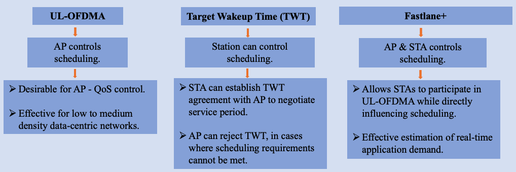 First and foremost, let’s take a look at the motivation behind Fastlane+. The 802.11ax standard introduced OFDMA and MU-MIMO as uplink transmission modes to allow scheduled access-based uplink transmissions. This allows the access point (AP) to dynamically schedule uplink OFDMA or MU-MIMO based on the client’s uplink traffic type and queue depth. This decision is made on a per Access Category basis and at the start of every Transmit opportunity (TXOP) with OFDMA used for latency centric low bandwidth applications. In contrast, MU-MIMO is used when higher bandwidth is required.