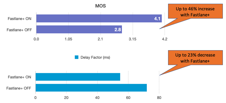 To better understand the benefits of Fastlane+, let’s first define key performance indicators of a typical voice and video application. Mean opinion score (MOS) is a standard measure for quality of experience for voice applications. It is quantified on a scale of 1 – 5, with 5 being the highest and 1 lowest. To put things in perspective, 3.5 is the minimum requirement for service provider grade quality.