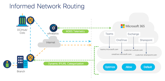 Cisco’s support of the URL categorization feature provides significant improvement in this area for those who use Cloud OnRamp with Microsoft 365. It allows you to create separate policies around specific types of traffic feeding into Microsoft 365, giving you more detailed control over traffic management within the platform. By creating different parameters for different traffic types, you can route traffic more efficiently around your needs and usage habits for optimized response times. Watch this how-to demo to see the Microsoft 365 integration in action.