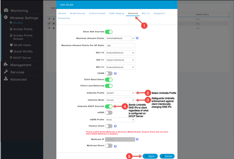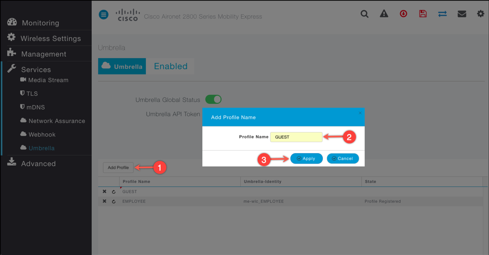 You can quickly and easily enable Umbrella policies per SSID in three easy and intuitive steps from the Cisco Mobility Express WebUI itself. The ability to map granular policies on a per-SSID basis allows the network to evolve rapidly to your changing business needs. All of this added protection is enforced without any additional latency, so the end user experience is not impacted.