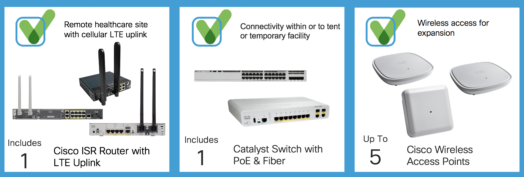 Inside Cisco and within our supply chain, we have identified collections of wireless networking equipment that we can quickly distribute to support pop-up clinics and rapid response healthcare systems across the globe. We are making simple kits – a router with LTE uplink, a switch with Power-over-Ethernet capability, and up to 5 wireless access points – available for quick shipment at no cost to qualifying healthcare institutions.