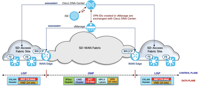 Figure 1 lays out the network design that customers can implement as part of the Integrated Domain solution. The Cisco DNA Center integrates with Cisco vManage. Cisco SD-Access Border and Control Plane functionalities are embedded on SD-WAN edge node thus simplifying the automation and orchestration capabilities. This automatically ensures end-to-end propagation of user context (SGT+VN) for policy enforcement.