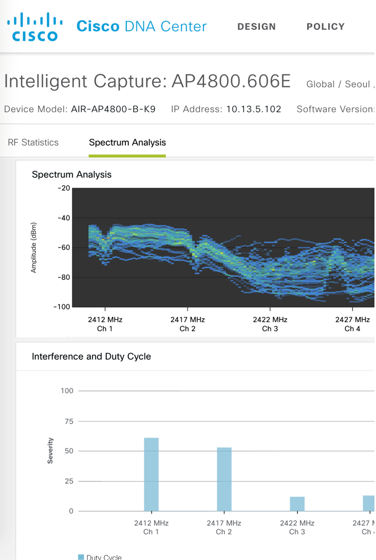 So, if you have seen these alerts on your home screen, it would be a good idea to see if Wi-Fi 6 can help mitigate this interference. If you go to the AI/ML “Trends and Insights” menu you can sort access points based on levels of interference. This can give you a list of your worst offenders. Click on one of the access points and look for the “Intelligent Capture” tool at the top of the window. This tool uses your network access points to perform complex packet, frame, and spectrum analyses.