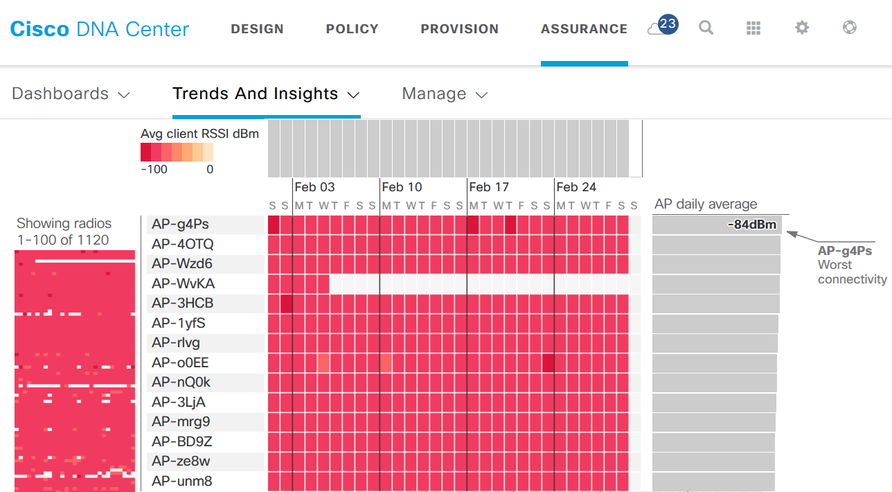 Go back to the AI/ML Trends and Insights and compare average client RSSI (Received Signal Strength Indicator) across all access point on your campus. This will tell you how each access point is receiving signal from the wireless clients. Access points with low averages should be selected for a Wi-Fi 6 upgrade.