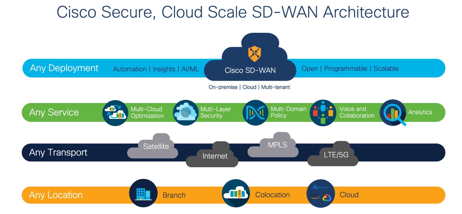 Cisco offers best in class software and hardware for SD-WAN. Through our traditional hosted products and our Meraki lines, we support multiple deployment models. Cisco SD-WAN supports the broadest range of options for any location, including both physical and virtual, for the branch or remote office, and for clouds and colocations. We ensure our customers have flexibility and choice for their various use cases.
