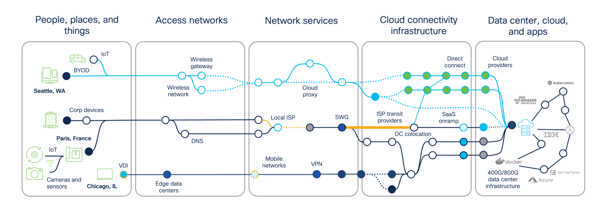As you go on your journey to consolidate and simplify your infrastructure, take this opportunity to bring all your IT operations teams together, along with users, so that the knowledge, skills, and processes in your network environment evolve as well. Try to avoid building another “cylinder of excellence” that is dedicated solely to cloud-based technology. While this may look like “plumbing” that doesn’t concern the business side, it is deeply user-facing in terms of performance and experience, and you may well discover important use cases when you include the end-to-end view.