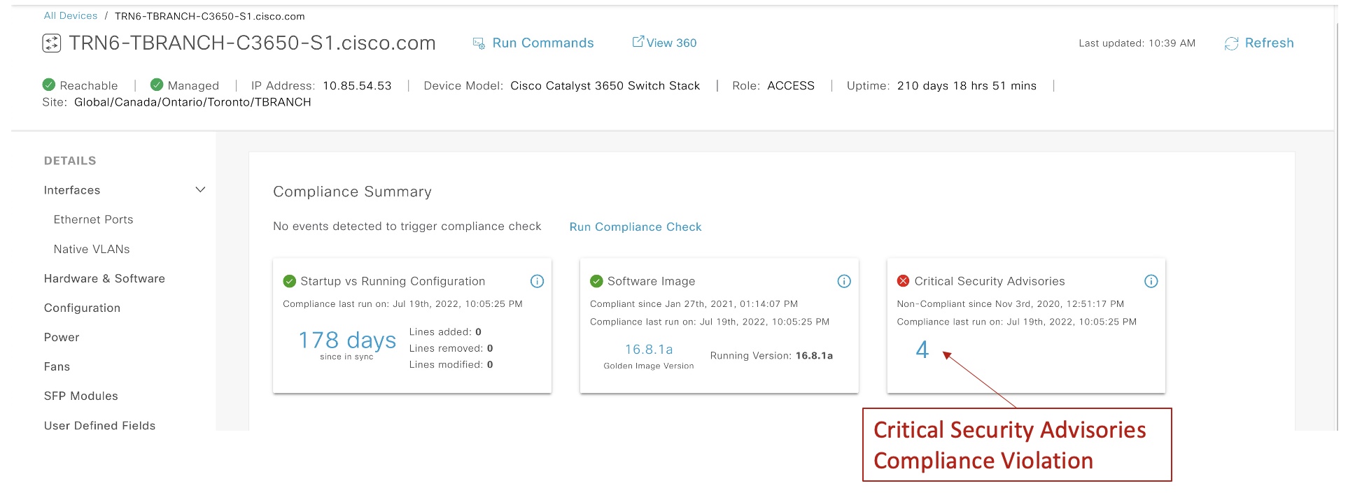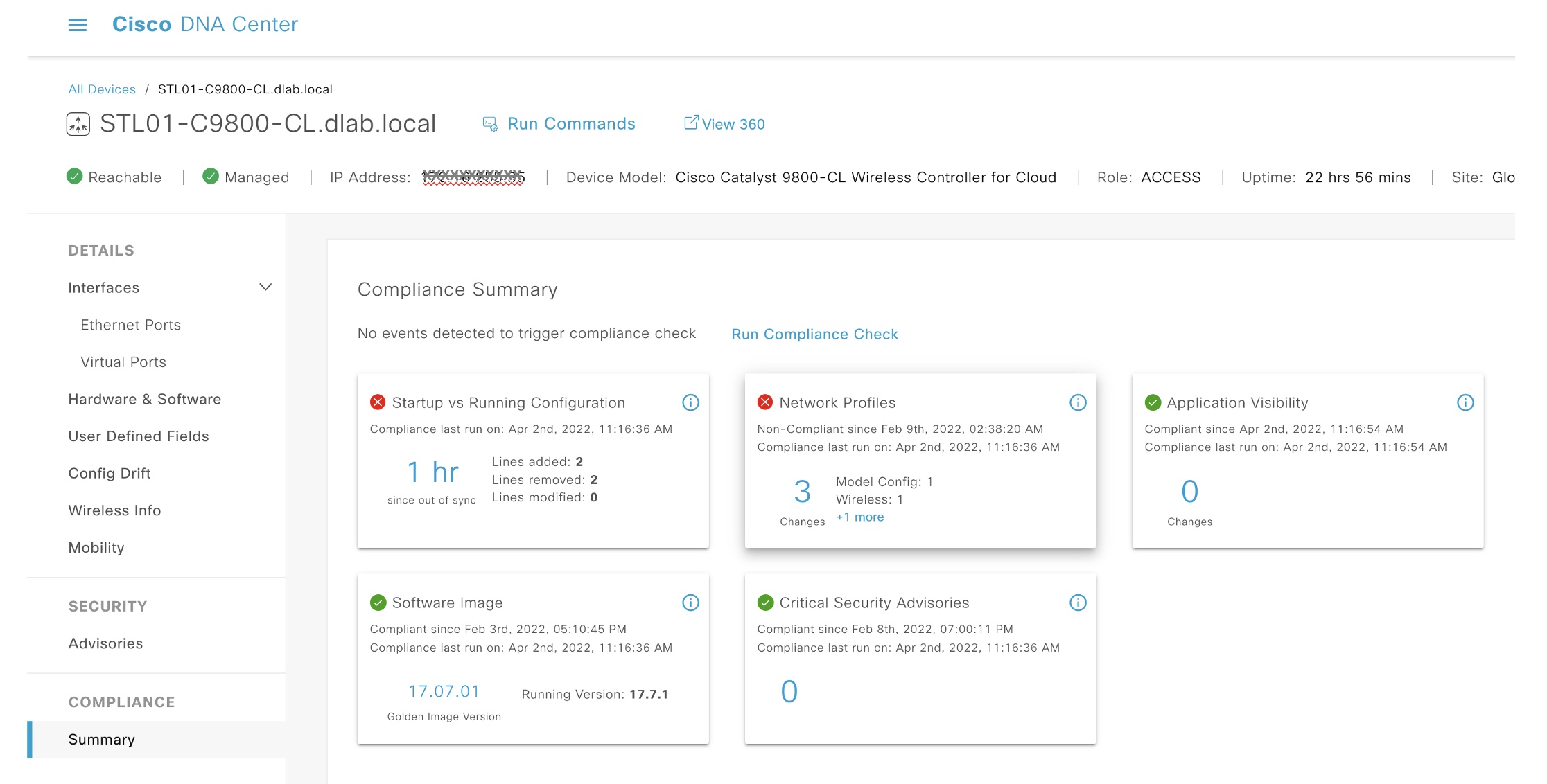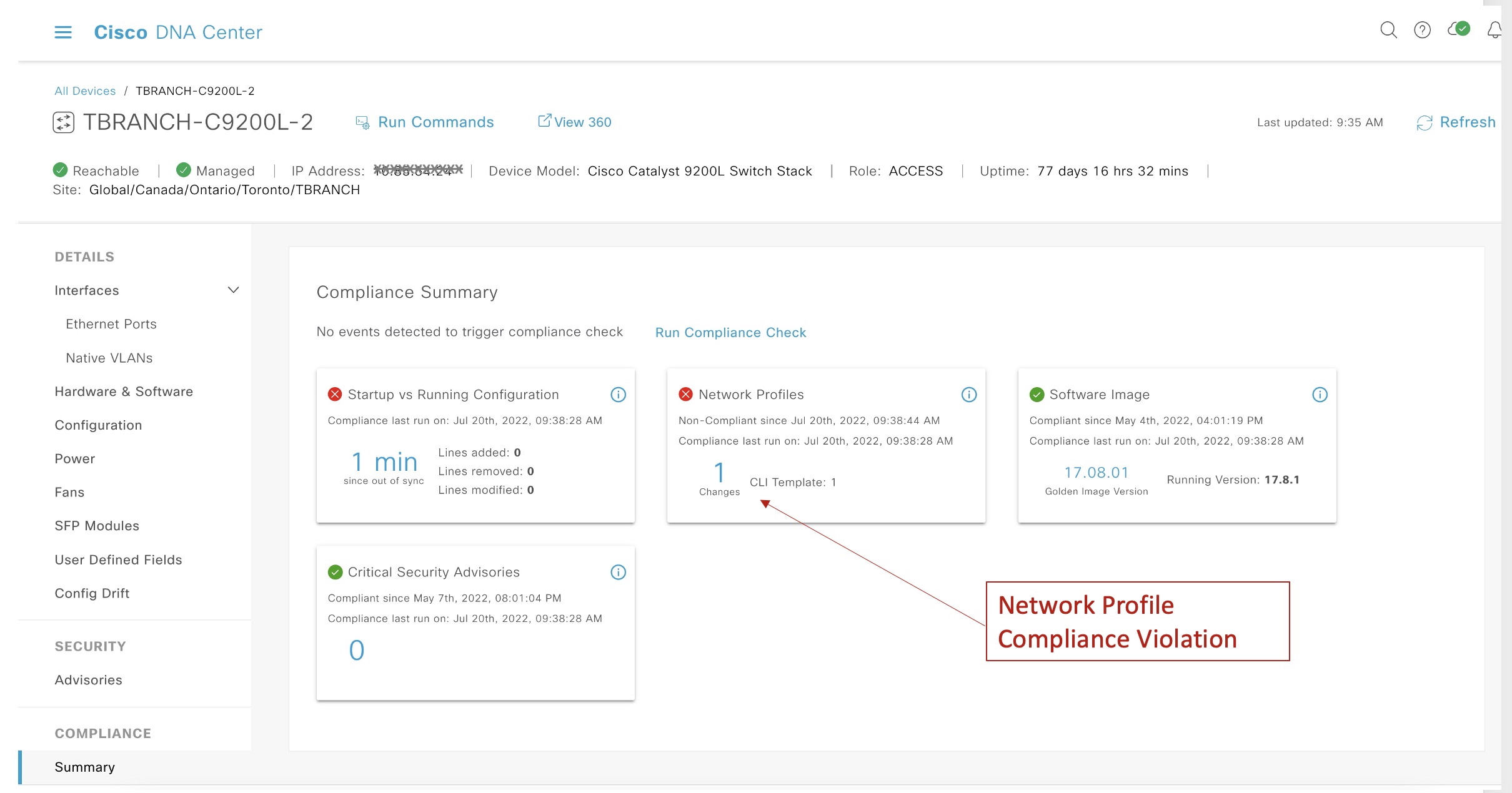 The current version of Cisco DNA Center, looks at device compliance from five different lenses in a non-SD-Access network: startup vs. running-config, network profiles, application visibility, software image, and critical security advisories.
