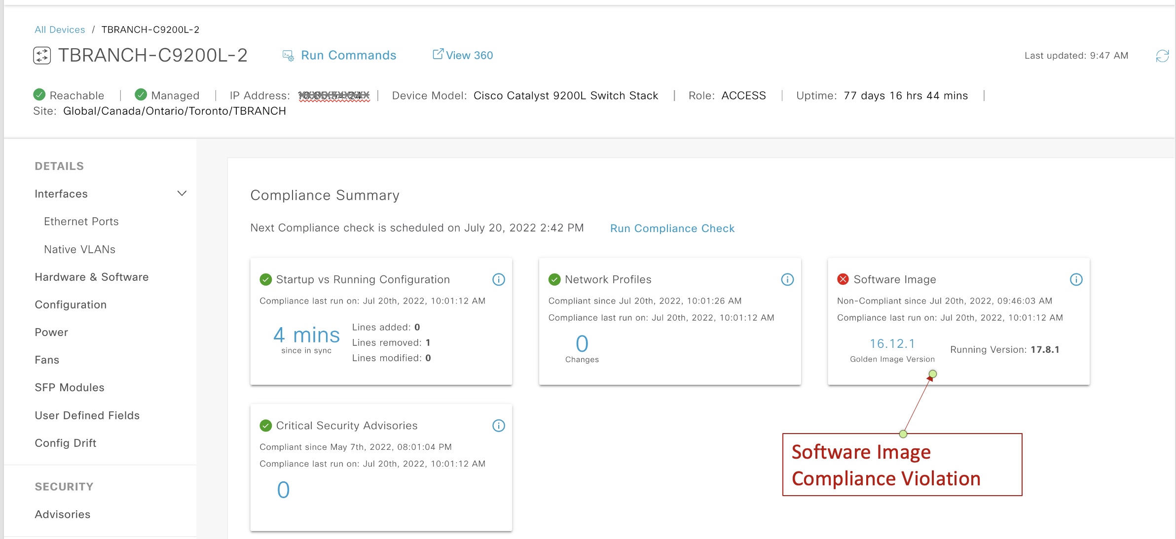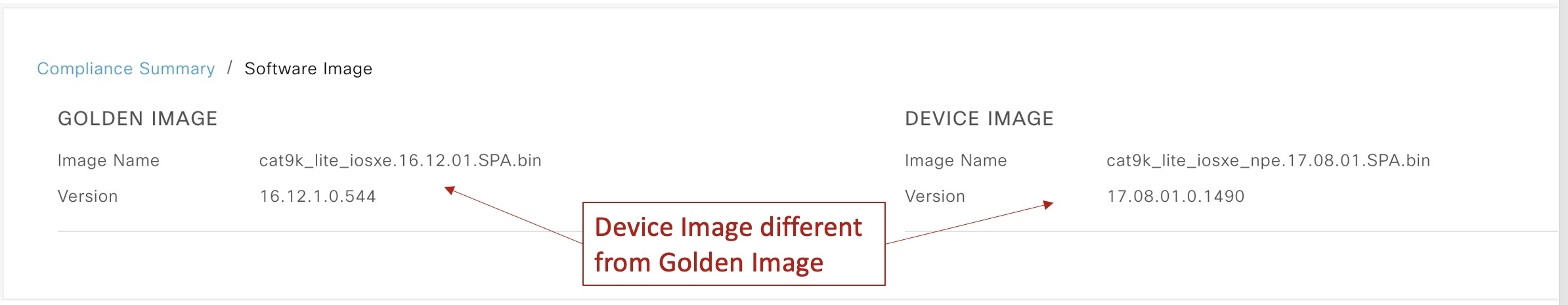 Cisco DNA Center uses the concept of “Golden Image” to support image consistency within a site. When devices have images different from “Golden Image”, it will trigger the “Software Image” compliance violation as seen in the snapshots below: