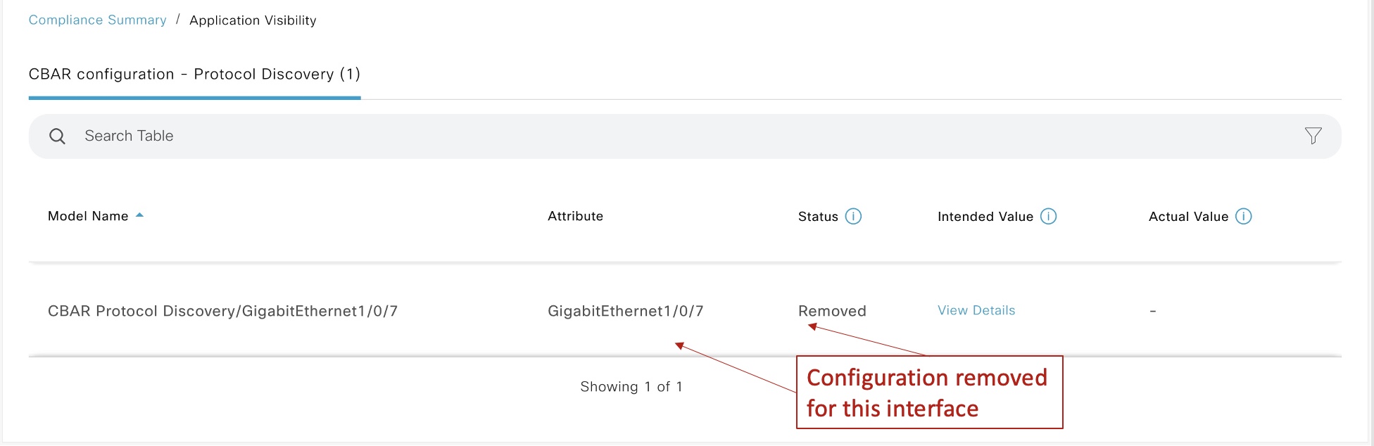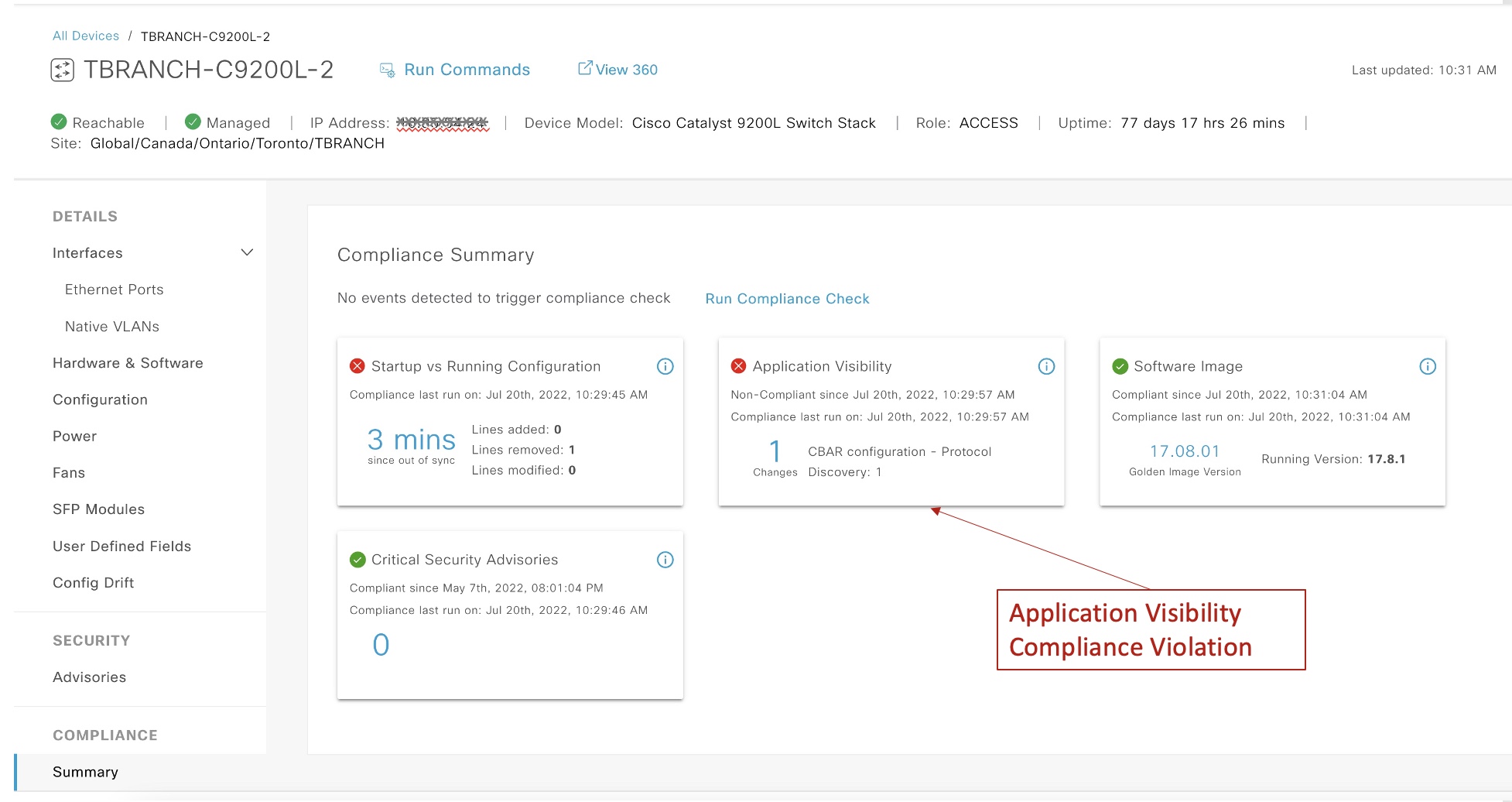 Cisco DNA Center also leverages Intent-Based Networking (IBN) to provision devices for visibility of applications through CBAR and NBAR. If there are any changes to this intent, the devices will be marked as non-compliant for “Application Visibility” as seen in the example below.