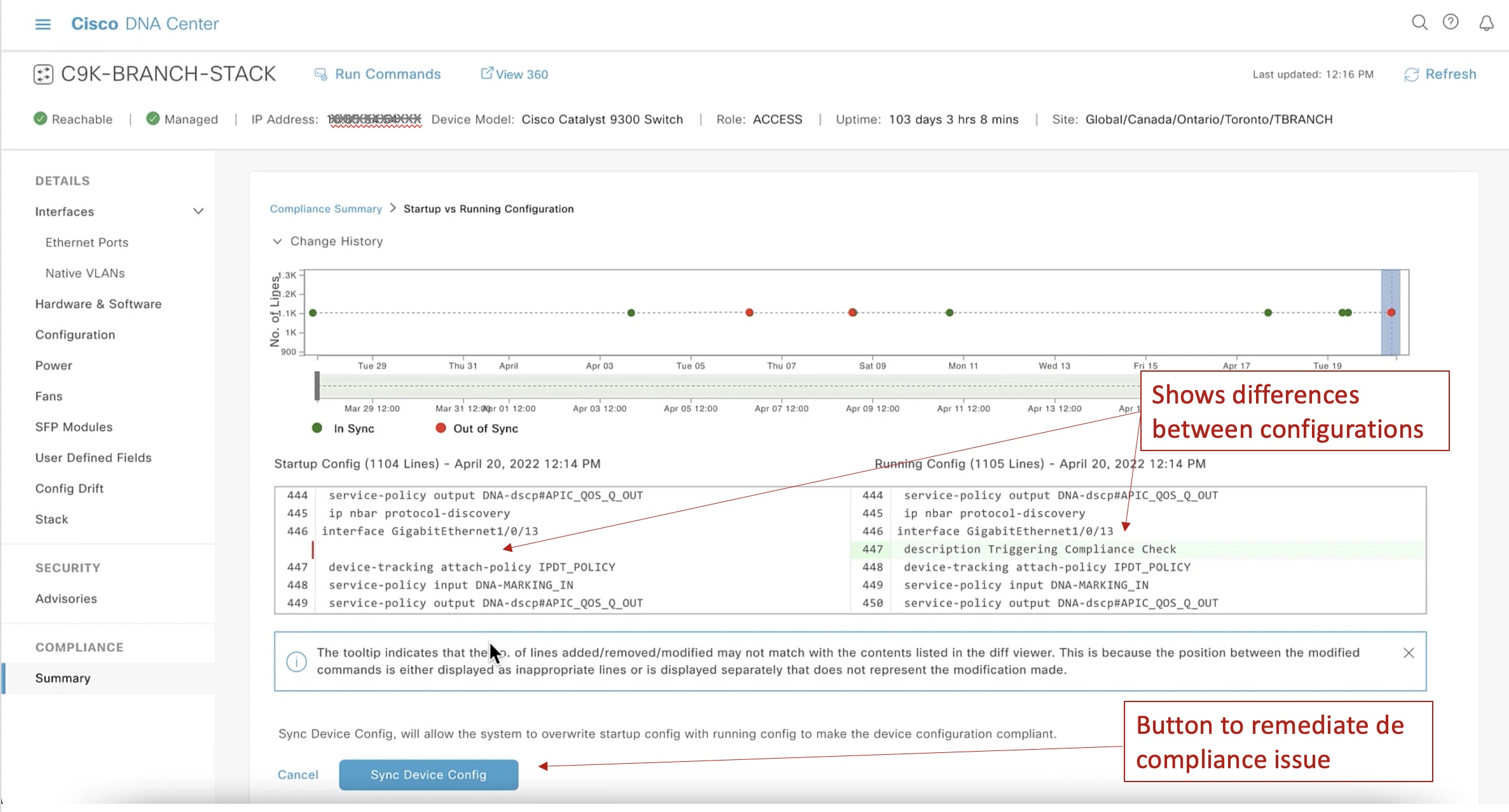 In the snapshot below, we see how Cisco DNA Center provides visualization of the differences between the running and startup configuration. In this example, the network administrator manually added a description to an interface and forgot to save the new configuration. Cisco DNA Center also provides a way to remediate this problem with a button to “Synch Device Config” which saves the running-config into startup-config.