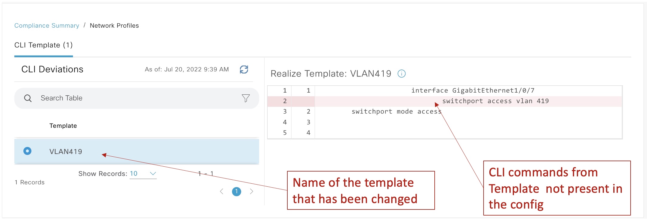 Cisco DNA Center clearly identifies the template that has been changed in the device and the specific lines of configuration that have been removed: