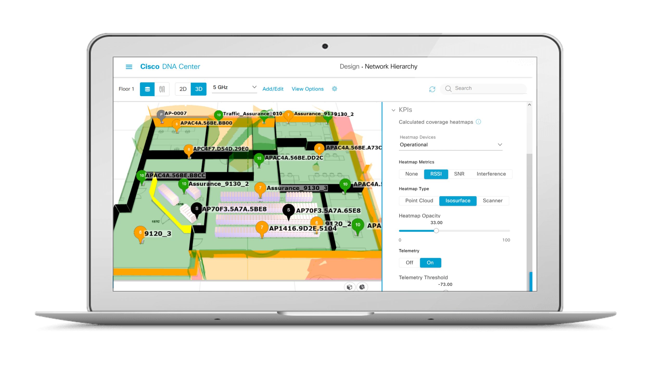 With the new Wireless 3D Analyzer, Cisco announces the first true 3D wireless indoor propagation tool. Use your mouse to move around and visualize where signal is propagating through the actual architectural design of your office. You can simulate adding walls or reorganizing the workspace to accommodate your return to office plan. Then do a simulation of the new wireless network design to support this new plan so that you buy what you need without over-dimensioning. And IT teams can simulate this office redesign without being in the office themselves.