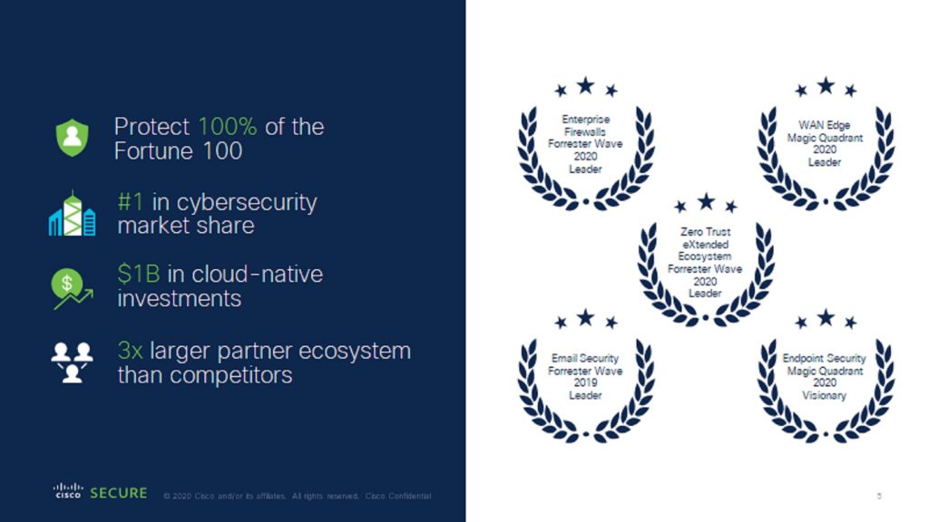 But don’t take our word for it. In addition to the accolades listed in the image to the left, the Cisco SASE offering won the CRN 2020 Tech Innovators Award for Networking and SD-WAN while Cisco Umbrella received the CRN 2020 Tech Innovators Award for best cloud security solution award for reducing complexity, silos and risk. And Gartner itself recognized Cisco as a leader in the SD-WAN Edge segment with a special callout of Cisco Umbrella integration as core strength. Not surprisingly, Cisco SD-WAN is trusted by thousands of companies, and field-proven by over 30,000 enterprises across the Meraki and Viptela products globally.